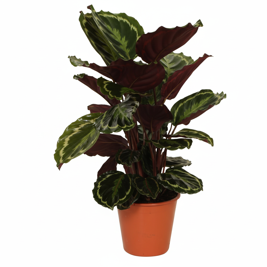 Aspetto della pianta: La Calathea Medaillon è una pianta appariscente con grandi foglie ovali. La parte superiore delle foglie presenta un bellissimo motivo di verde scuro con macchie verde chiaro, mentre la parte inferiore ha un colore rosso porpora intenso. Il contrasto unico tra la parte superiore e inferiore delle foglie rende questa pianta un vero e proprio punto focale in ogni interno. Le foglie sono setose e formano bordi eleganti e ondulati.