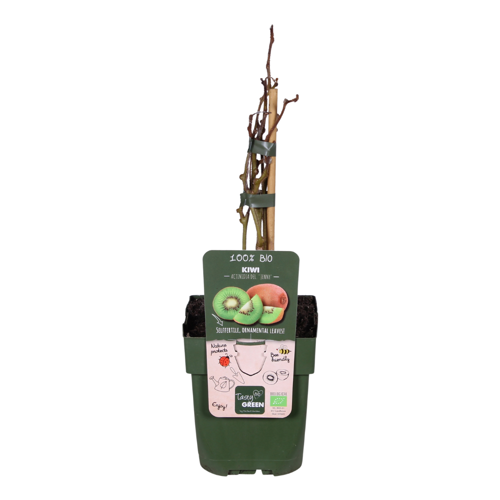 ‘Actinidia delciosioa Jenny’ is een gemakkelijke en zelfbestuivende kiwi. De kiwi vind zijn oorsprong in China. In het begin van de 20e eeuw werden er zaden naar Nieuw-Zeeland gehaald. Toen de kiwi een belangrijk export product werd is de plant vernoemd naar de bekende loopvogel, de Kiwi. Het is een snel groeiende slingerende klimplant en kan het beste tegen een klimrek, schutting of pergola geplaatst worden. De kiwi bloeit in de maanden mei en juni met wit-roze bloemen. Begin september zullen de eerste rijpe vruchten verschijnen. Houdt er rekening mee dat het enkele jaren kan duren voordat de plant vruchten gaat geven. Over het algemeen duurt dit zo’n drie tot vijf jaar. De vruchten hebben een harige schil, zijn ovaal van vorm en hebben heldergroen vruchtvlees, met een witte kern en een ring van zwarte pitjes rondom deze kern. De kiwi is gezond en bevat veel vitamine C.