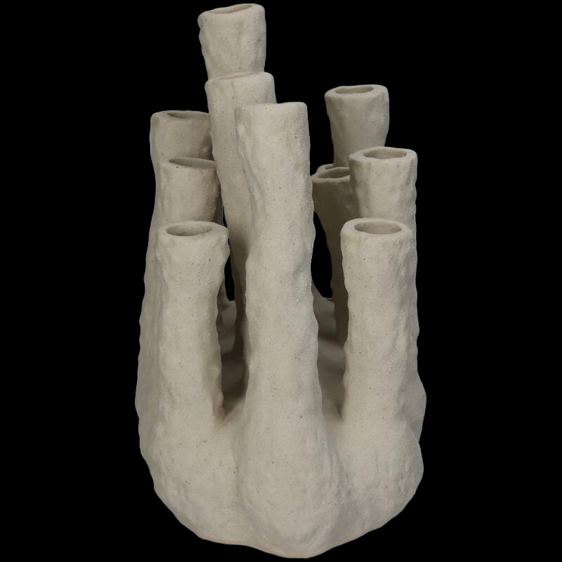 Deze bloemenhouder XL in koraalvorm is een opvallend en stijlvol decorstuk dat organische elegantie toevoegt aan je interieur. De ecru kleur en matte afwerking geven hem een natuurlijke uitstraling die perfect past bij boho, landelijk of modern wonen. De vele tuiten maken hem ideaal voor speelse bloemcomposities of droogbloemen.