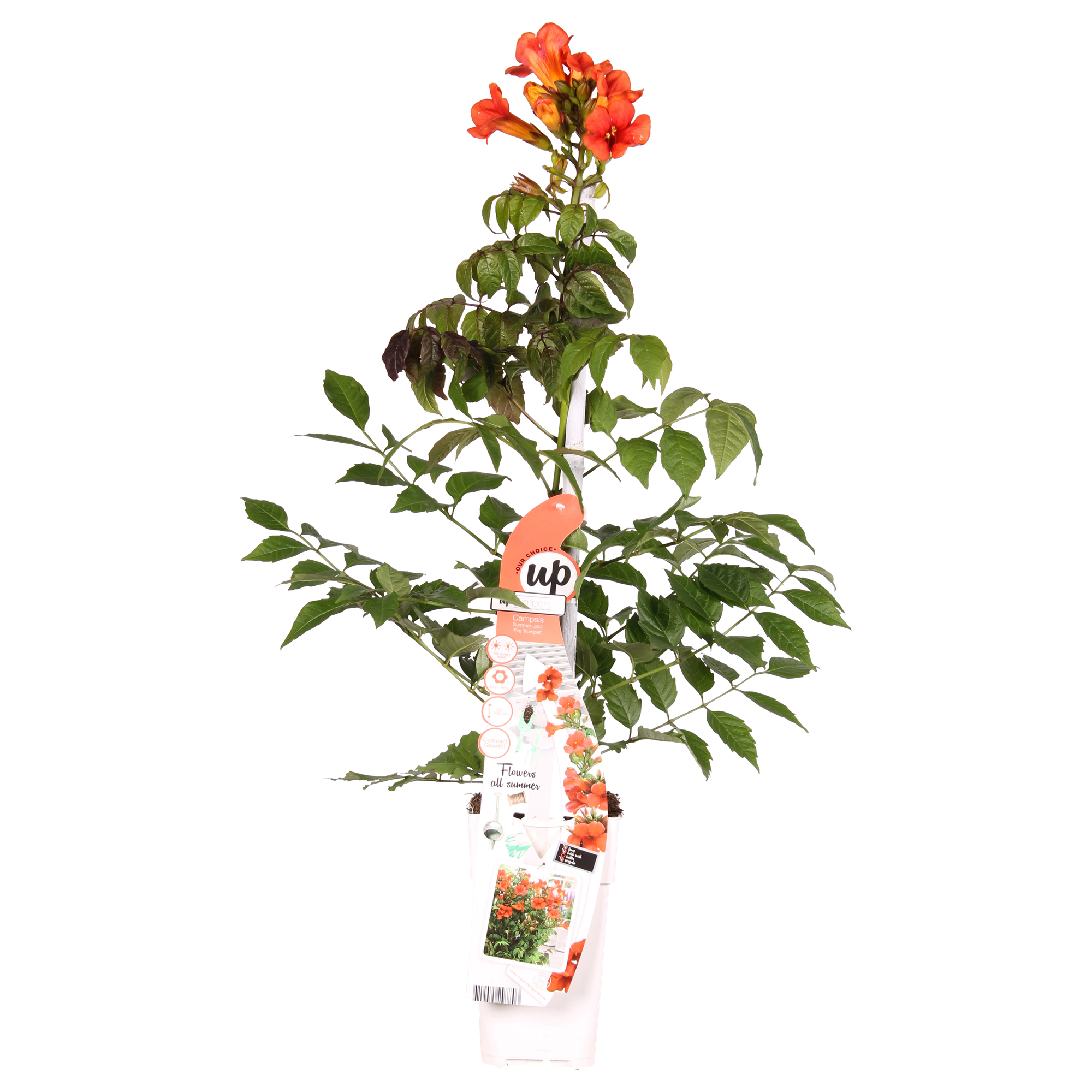 'Campsis Summer Jazz Fire Trumpet'' is een winterharde trompetklimmer welke uitbundig en langer door bloeit bij veel zon. De rood bloemige Campsis groeit compacter dan andere soorten uit de Summer Jazz-serie, namelijk maximaal 3 meter hoog. De late zomer bloeier heeft de neiging om zich naar een struik te vormen. Wanneer je de Campsis wilt laten klimmen is het handig om het te ondersteunen met bijvoorbeeld een klimrek aan het begin van de groei. Deze Campsis is een zelfhechtende klimplant wat betekent dat er kleine hechtworteltjes vanuit de takken worden gevormd. Deze hechtworteltjes zullen zich langs de muur of schutting hechten.