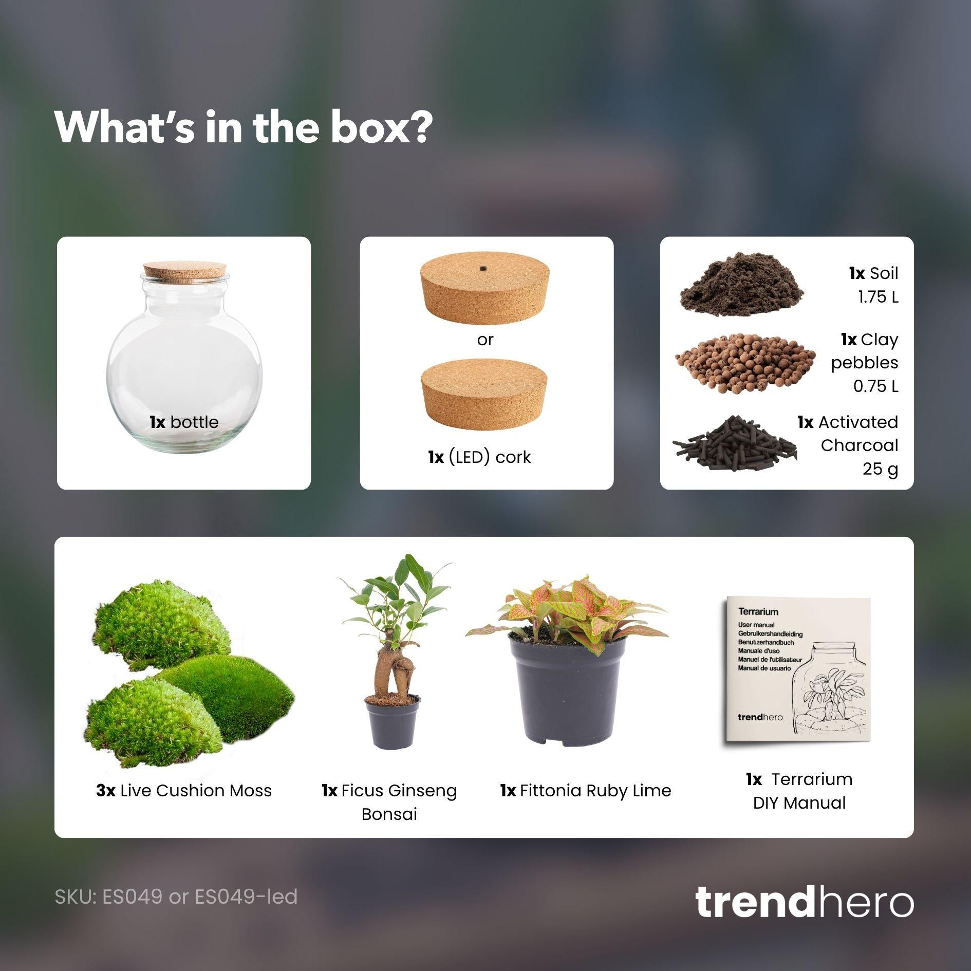 Onze Do-It-Yourself (DIY) planten terrariums worden geleverd als een DIY pakket. Na ontvangst zet jij met het meegeleverde 5-stappenplan in een handomdraai je nieuwe groene vriend in elkaar.