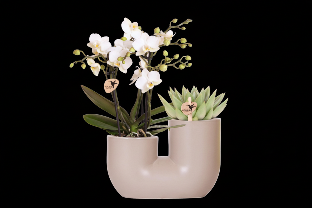 Aan de ene kant vind je de phalaenopsis orchidee ‘Zürich’ met haar witte bloemen, terwijl aan de andere kant de robuuste en trendy succulent ‘Miranda’ voor een mooi contrast zorgt.