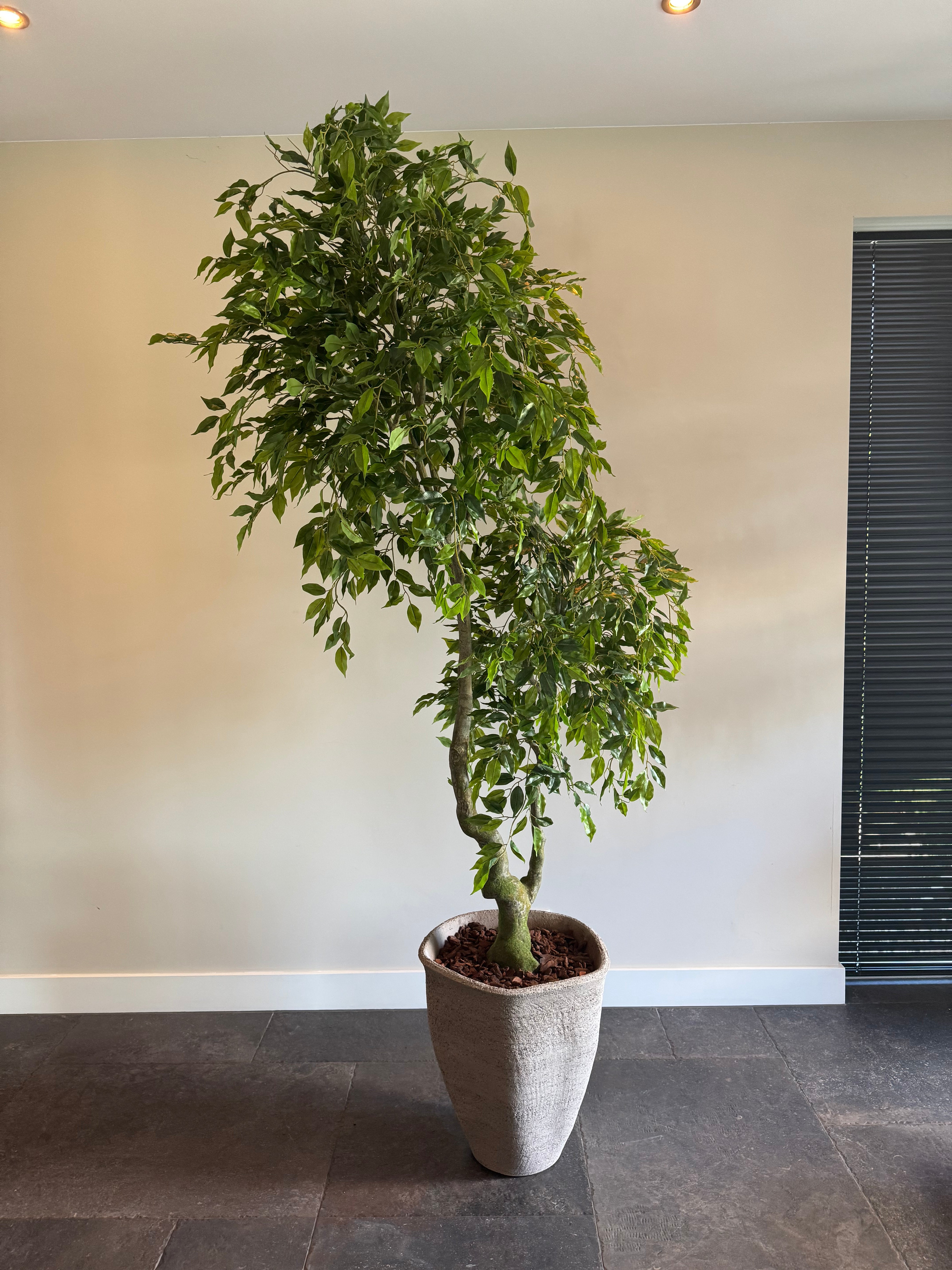 De zijden Ficus Benjamina van 210 cm is een elegante kunstboom met een volle bladstructuur en verfijnde uitstraling. De smalle, glanzende blaadjes en de sierlijk vertakte stam geven deze klassieker een levensecht en tijdloos karakter. Perfect voor het toevoegen van rust, hoogte en groen aan grote ruimtes.