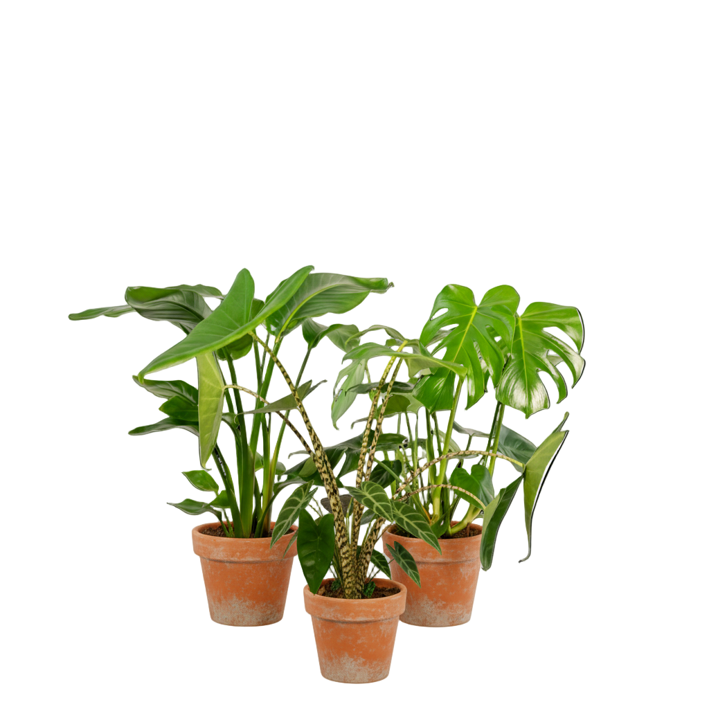 Deze kamerplantenmix zorgt voor een groene vibe in huis. De Monstera Delicosa, Alocasia Zebrina en de Strelitzia Nicolai zijn de ideale ingrediënten voor een tropische cocktail.
