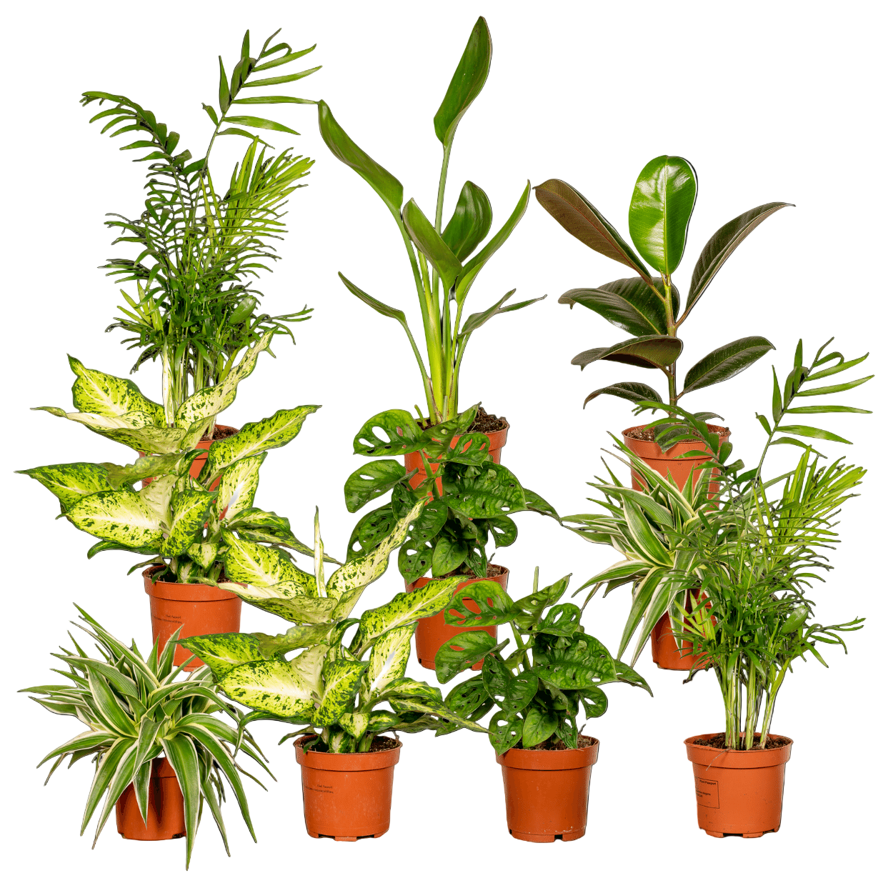 De Verrassingsbox - x10 bevat tien zorgvuldig geselecteerde kamerplanten met een gevarieerd en aantrekkelijk uiterlijk. De planten variëren in kleur van fris groen tot donkerpaars, met bladeren die glanzend, mat, of licht behaard kunnen zijn. Sommige planten hebben compacte, volle bladeren, terwijl anderen ranke en sierlijke bladeren hebben. De unieke combinatie van verschillende bladvormen en kleuren zorgt voor een dynamische en levendige sfeer in je interieur.
